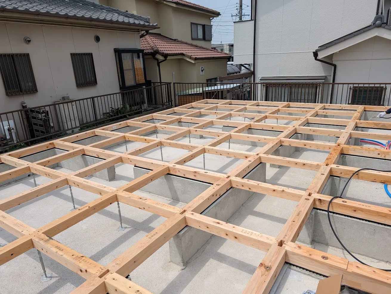 【名古屋市】新築工事 土台敷 今回は社長の真寿が書きます。名古屋市の新築工事の土台敷です。今はプレカットが、正確なので、とんとん進みます。防蟻処理して、プレカットした断熱材を敷き込み雨養生して、完了です。